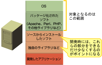 セキュリティアップデートをホスティングサービスに依頼する場合、注意したいのは、サーバの基本的なパッケージのみのアップデートであるという点だ。つまり、OS本体やRPMパッケージなど、パッケージ化されたものだけが更新対象となる(図2)。更新から除外されてしまうのが、独自にカスタマイズなどを行ったソースから構築している場合や、Webアプリケーションが独自のライブラリを使っている場合である。このようなソフトウェアは更新対象とならないため、関連する情報に日ごろから目を光らせておく必要がある。このような点からも、近年では、商用のWebアプリケーションを構築する場合には、よほどのカスタマイズを伴うチューニングが必要な場合を除き、ソフトやライブラリをソースから構築することなくパッケージとしてインストールすることがほとんどだ。