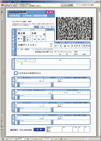 このほか、PDFはワークフローの帳票としても有効に利用できる。PDFは閲覧に最適なドキュメントフォーマットという印象が強いが、実は入力フォームを自由に配置し、必要事項を記入させる文書としても扱える(画面2)。つまり、リッチクライアントのような使い方だ。これはすでに、地方自治体や銀行などの申請書類、申込書などで活用されている。