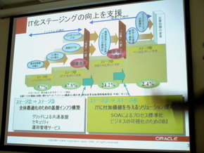 ステージ2までの企業は、業務の効率化とある程度のコスト削減は実現できるが、まだ経営に対して付加価値を与えるには至らない。ステージ2と3の間には組織の壁が存在し、ステップアップするにはITシステムの進化だけではなく、組織改革も同時に実施する必要がある。さらにステージ3から4へのステップアップには、SOAによるプロセスの標準化やビジネスの可視化のためのBIが必要になり、この部分が経営に対しての付加価値となっていく。それぞれについて、1つ上のステージにアップさせるのが日本オラクルの役目であり、そのときに活躍するのがOracle Gridによる統合基盤だという。