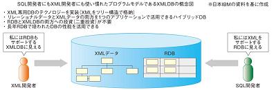「DB2 9」はRDB構造でありながら、XMLデータの処理に最適な格納方式を採用したことで、ピュアなXMLをサポートする。XML開発者は「Xquery」(XMLデータソースを照会する言語)でRDBにアクセスでき、SQL開発者はXMLをサポートするRDBとして扱うことができる。