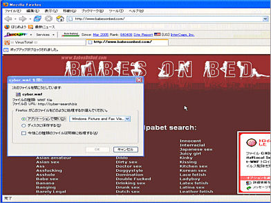 ここではFirefoxを使ってアクセスしているため、トロイの木馬を仕込むWMFファイルのダウンロードを行おうとしていることを警告するウインドウが表示されている。またMcAfeeの対策ソフトウェアでも、WMFの脆弱性の攻撃を検知し、警告を表示していることが分かる。