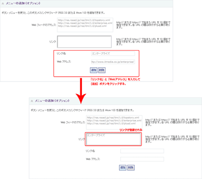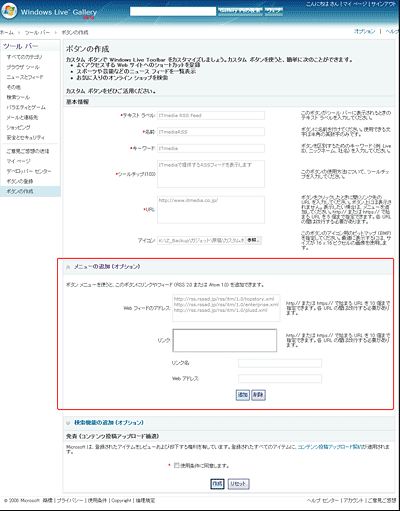 RSSフィードやリンクメニューを作るには、カスタムボタンの作成画面において[メニューの追加(オプション)]を開き、次のように操作する。