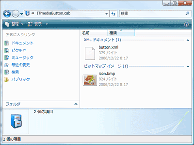 このファイルはWindowsのCab形式のファイルであり、拡張子を.cabに変更して読み込むと、button.xmlというファイルであることが分かる。これがカスタムボタンを構成するXMLデータの正体だ(画面15)。