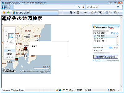 ここでの例は、「Live Contacts Control」と「Virtual Earth Control」を組み合わせて連絡先を地図上に表示する例を示したが、ほかにも、地図情報を使ったWebアプリケーションは、さまざまなものが考えられるだろう。
