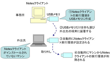 また、USBデバイスを取り外すと、PCからNotesクライアントの環境を自動的に削除されるため、余分な情報が残らない。ネットワークに接続できるPCを借りることができる場合は、USBデバイスのみ持ち運べばよく、ノートPCを持ち運ぶ必要がなくなる(図4)。