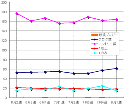 今週は、およそ2カ月ぶりに投稿されたブログ数が61(前回比+4)と60台になった。グラフを見ると、先々週から右肩上がりになっているのが分かる。投稿されたエントリー数も、先々週と比べると少ないが、先週より+2の164だ。これは、4つ以上投稿されたブログが18(前回比+1)、1つのみの投稿が14(前回比−11)となっていることも要因のようだ。つまり、2〜3つの投稿があったブログが少なからずあったことを示している。