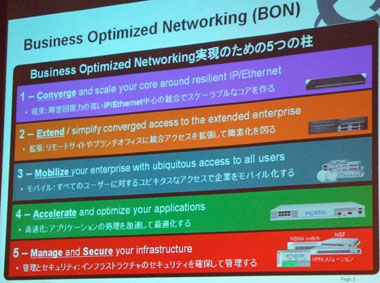 エンタープライズ&チャネルズ営業本部の犬塚昌利部長は、「BONでは5つの柱を設定している。Secure Router 4134はブランチオフィスのアクセス環境を簡素化し、ユーザーが心から使いやすいと感じられるネットワーク環境を実現できるだろう」と、新製品の狙いを説明した。