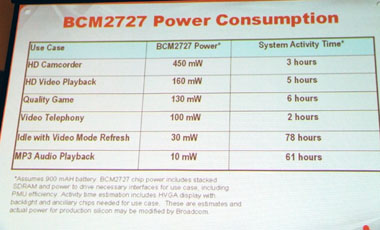 BCM2727は、同社のマルチメディアプロセッサシリーズ「VideoCore」の第3世代になる製品。映像では720/30pのH.264/AVC High ProfileとMPEG-4 Simple Profileの録画・再生をサポート(再生はMPEG-1、同2、VC-1もサポート)する。また、1200万画素クラスのJPEG画像や2D/3Dグラフィックをサポートする。