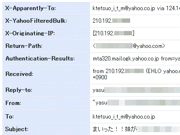 Yahoo!メールの迷惑メールに入ったメールには「X-YahooFilteredBulk:」という独自ヘッダが追加されているため、筆者は「Yahoo!は大量送信をスパムと疑っている」と判断している。ちなみにこのメールは台湾からの送付だった