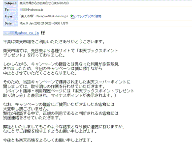 2006年冒頭に届いた「楽天からのお詫びメール」は冒頭の宛先人以外の文面が同じだったためか、あまりにも膨大なメール数だったためなのか分からないが、Yahoo!メールの迷惑メール扱いになっていた。ちなみに筆者のこれは正規の利用であったため、後日加算処理が行われ、その旨を告げるメールが届いた大量同時送付がスパムのパターンである以上、汎用フィルタに文句は言えないだろう(Gmailのフィルタにも某社は引っかかっている)。逆に言うと、企業が発信するメールを確実に顧客に届けるためには、送付方法に配慮しておく必要がありそうだ。
