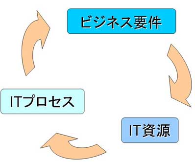 これを図に示したものが、図3である。12時の方向に「ビジネス要件」と書いてある。ここはCOBITの書籍には「情報」と書いてあるのだが、それだと混乱を招くので、勝手ながら筆者の理解の範ちゅうで変更させていただいた。これは、ビジネス目標やガバナンス目標を達成するためにビジネス要件があり、そのビジネス目標を達成するためのIT資源をコントロールするプロセスドメインが4種類ある、という考え方である。