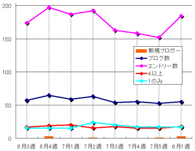 ここのところ減少傾向が見えたエントリー総数が、グッと右肩上がりになった。しかし、その一方で、投稿されたブログ数などは、ほぼ横這いである。夏期休暇や猛暑などが影響して、数多く投稿するオルタナティブ・ブロガー(オルタナブロガー)が、ここしばらくの間あまり書けなくなっていたせいだろうか。