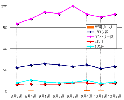 それでは、10月9日〜10月15日を10月2週として、過去8週分のオルタナティブ・ブログへの投稿状況を可視化したグラフを見ていただきたい。