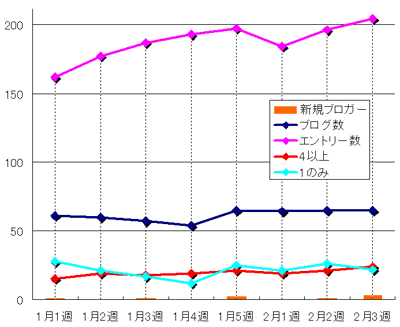 今回はついに投稿総数が200の大台を突破した。投稿されたブログ数そのものは平行線なのだが、1つのみの投稿をしたブログが微減し、4つ以上投稿したブログが微増し、前回と逆転した。これが投稿総数の増加を促進したのだろう。
