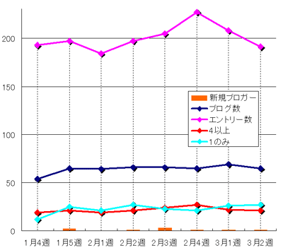 それではここで、3月12〜18日を3月2週とした過去8週分のオルタナティブ・ブログへの投稿状況を可視化したグラフを見てほしい。