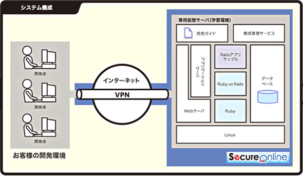 同サービスには、ハードウェアやソフトウェア、ネットワークなどのITリソースを提供する日立ソフトのPaaS(サービスとしてのプラットフォーム)型IT基盤提供サービス「SecureOnline」の仕組みを活用。ユーザー企業ごとに構築した仮想サーバ上にRuby on Rails実行環境とRailsアプリケーションを構築し、ネットワーク経由で機能を提供する。ユーザー企業はIT機器の調達費用や資産管理を気にせずに、必要な開発環境を利用できる。