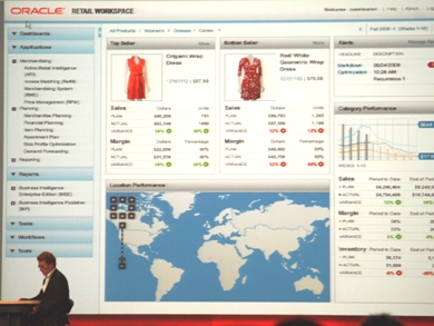 アプリケーションは、どの服がどこにあるのか、どの服をどの店で販売するべきかといった判断をするための情報をそろえている。デモでは、米国本土において各商品別に、北東部に流すべきもの、カリフォルニアに流すべきものといった判断をアプリケーションの画面上で簡単に把握できる様子が伝えられた。