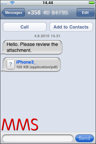 上の画像にクエスチョンマークがあるのがお分かりだろうか? 幸いなことに、MMSメッセージに対するiPhoneの標準サポートは、PDFのローンチを防止する。これは非互換によるセキュリティといえるかもしれない……。