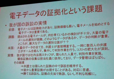 国内の状況について、牧野総合法律事務所の牧野二郎弁護士は、電子証拠の開示を法律などで義務化する動きはないものの、実際には米国と同様に企業での情報化が進んでいるために、膨大な量の電子メールなどから証拠を取りまとめる作業が大きな負担になっていると話す。こうした作業は、まず社内の法務担当者が行い、ある程度内容をまとめたものを弁護士がさらに精査する。だが限られた人数と時間で行わなければならず、十分な証拠をそろえることができない場合がある。