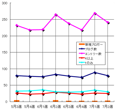 投稿総数が前週より減少したが、それでも200本以上のエントリーが書かれている。オルタナブロガーの高いモチベーションが伺える。また、7月7日に黒沼透氏「Social Streamline」と徳本昌大氏「ソーシャルおじさん徳本昌大のソーシャルコミュニケーション最前線」、7月13日に吉沢康弘氏「YLOGオルタナティブ」と、3人の新ブロガーも誕生した。彼らの活躍にも期待したい。