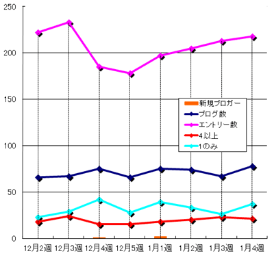 ここしばらく投稿総数曲線が右肩上がりの傾向が続いている。とはいっても、ブロガー当たりの投稿本数はあまり増えていない。年度末に向けて、引き続き注目したいところだ。
