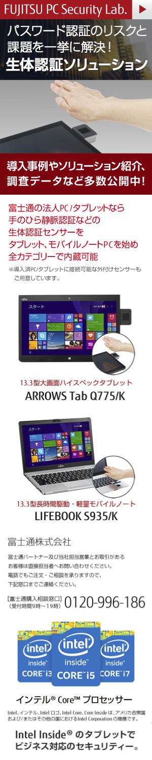 富士通が法人向けに提供するタブレット端末「ARROW Tab」とノートPC「LIFEBOOK」の一部機種には、本人しか持ち得ない体内情報を用いて認証を行う「手のひら静脈センサー」が搭載されている。高氏が述べた「他人がなりすますことができず、必ず本人特定できる」認証によって、セキュリティ強化を実現するものだ。本体に内蔵されるほどにセンサーは小型化されており、自然な認証が可能となり利便性向上にもつながるほか、いつ、誰が認証を経てログインしたかを確認できるログ管理も可能で、不正の「検知」にも役立つソリューションといえるだろう。