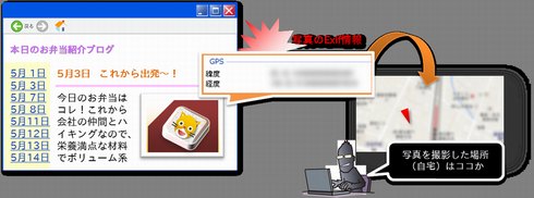 休暇中は楽しい気分からついつい安易な投稿をしてしまいやすい。スマホのカメラやカメラ機能を使うアプリ、デジカメでは写真データのExifに、撮影場所や日時、機種名など情報が付与されてしまう(設定で変更できる場合もある)ため、閲覧者がExifデータを使ってユーザーの情報を探れてしまう。例えば、子どもの入学式で撮影したランドセル姿の写真から学校名や場所を特定でき、自宅の料理写真をアップすれば、自宅の住所が簡単に知られてしまう。