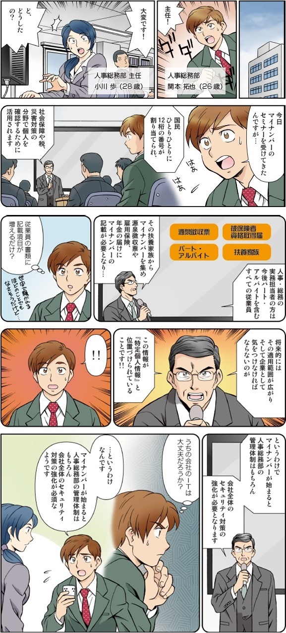 2016年1月に始まるマイナンバー制度。マイナンバー(個人番号)は「特定個人情報」に該当し、その情報漏えいを防ぐため、大企業だけでなくあらゆる企業に安全管理措置の実施が法律で求められている。パート、アルバイトを含めたすべての社員とその家族のマイナンバーを管理する企業に求められるセキュリティ対策とは? マンガで解説しよう。