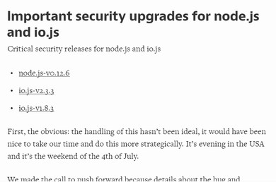 この問題は更新版の「Node.js 0.12.6」「io.js 2.2.3」「io.js 1.8.3」で修正された。
