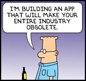 「アプリが君の人生を壊すのさ」とディルバート。仕事が人から機械やアプリにとって代わられるのはリアルな話ではありますが……。