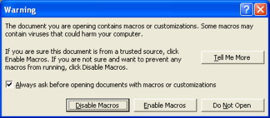 Officeでマクロを実行するためには、まず複数の手順を経てマクロを有効にする必要がある。Office 97ではマクロの危険性について明記したダイアログボックスを表示。Office 2003までのバージョンでは情報量はやや少なくなったものの、やはりダイアログボックスが表示されていた。