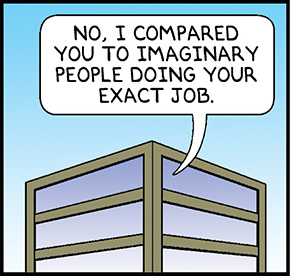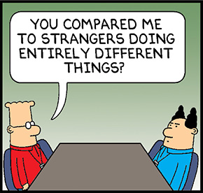それに対して「もの」や「人」を扱うのが得意というときは“I'm good with”を使います。“I'm good with people.”というと「人と接するのがうまい」、“I'm not good with numbers.”というと「私は数字が苦手」となります。“Dilbert is good with handling pointy-haired boss.(ディルバートはとんがり頭のボスの扱いがうまい)”とは……いえないか……。