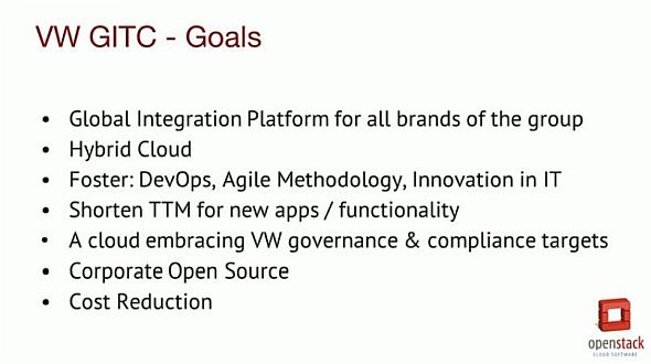 より具体的なVW GITCの目標としては、「VWグループにおける全ブランドのためのグローバルな統合プラットフォームになること」「ハイブリッドクラウドを活用すること」「DevOps、アジャイルな開発メソドロジー、ITイノベーションを促進すること」「新しいアプリケーションや機能の市場投入までの時間を短縮すること」「VWグループのガバナンス、コンプライアンス目標に対応したクラウドの運用」「オープンソース的な社内文化を醸成すること」「コスト削減」を挙げている。