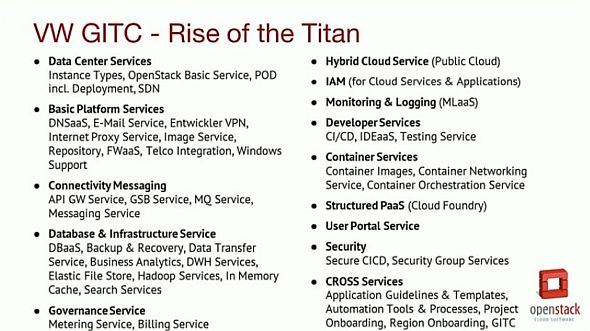 VWグループは、「Volkswagen Group IT Cloud(VW GITC)」と呼ぶ、グループ全体を対象としたプライベートクラウドの整備を進めている。この取り組みが始まったのは比較的最近だ。2015年の7〜8月に計画を立案、9〜10月にPoC(Proof of Concept)およびベンダー選択を実施、2015年の12月までにOpenStackインフラの稼働を開始した。その後2016年6月までに、PaaS基盤であるCloud Foundryの提供を開始するなどし、本格稼働に至っている。規模は、2016年5月時点でCPU 3600コア、ストレージ 840TBだという。チェコに開設する新拠点は、これと同等の規模でスタートするとしている。