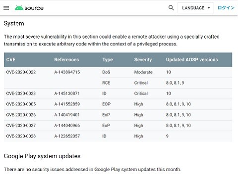 Googleは2020年2月3日、Androidの月例セキュリティ情報を公開し、多数の深刻な脆弱(ぜいじゃく)性に対処したと発表した。通信キャリアや端末メーカーなどのパートナー各社には1カ月前までに通知済みで、ユーザーにはパートナー企業を通じてセキュリティパッチが配信される。