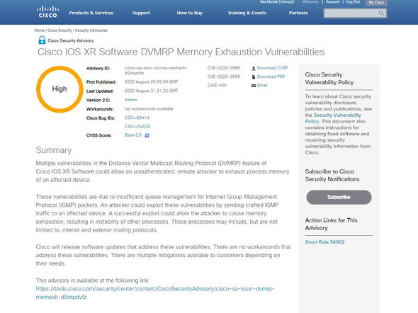 同社が2020年8月29日に公開したセキュリティ情報によれば、脆弱性はIOS XRのマルチキャスト(注)を支える機能の1つ「Distance Vector Multicast Routing Protocol」(DVMRP)機能に存在する。
