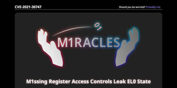 LinuxをApple M1へ移植する取り組みの副産物としてApple M1にプロセッサ設計上の脆弱(ぜいじゃく)性が明らかになった。開発者はこの脆弱性を「M1RACLES」と呼ぶとともに、次のページで発見された脆弱性の詳細を説明している。