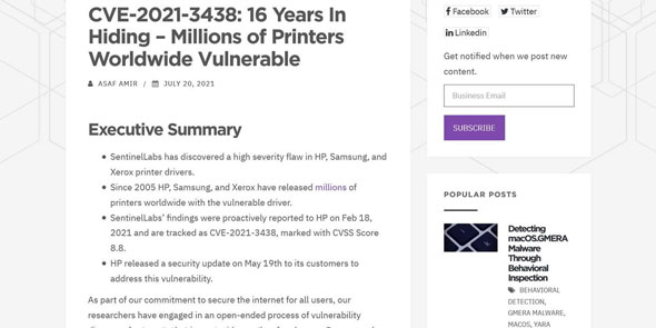 セキュリティ企業のSentinelLabsは2021年7月20日(現地時間)、同社のブログでHPとSamsung、Xeroxのプリンタドライバに深刻度の高い脆弱性を発見したと伝えた。これらのプリンタドライバは、2005年以降に出荷されたHPとSamsung、Xeroxのプリンタに同梱されていると説明されており注意が必要だ。