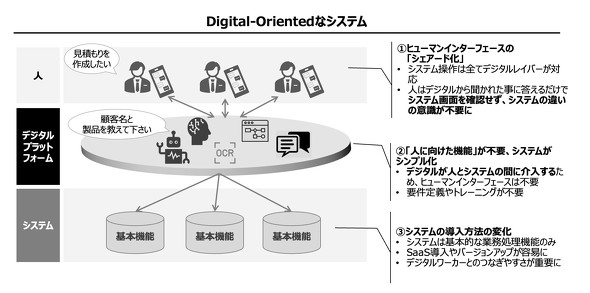 この壁を乗り越える上でカギとなるのが「Digital-Oriented(デジタルオリエンテッド)」への発想の転換だ。これまで人にインプットしていた要素をデジタルツールに移管して「デジタルを中心に業務を回す」ことで、変化に強い業務スタイルや組織を実現する。