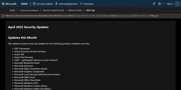 Microsoftは2022年4月の累積更新プログラムを配信した。今回のアップデートには深刻度「緊急」に分類される脆弱性の修正が含まれている他、既に悪用が確認されているゼロデイ脆弱性も含まれている。