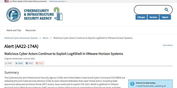 CISAとCGCYBERはVMware HorizonおよびUnified Access Gateway(UAG)に関するセキュリティアドバイザリーを公開した。これによると複数の脅威アクターが、Apache Log4jの脆弱性である通称「Log4Shell」を利用してこれらのVMware製品にサイバー攻撃を仕掛けている。
