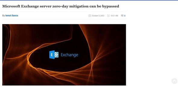 Bleeping Computerは2022年10月3日(現地時間)に「Microsoft Exchange server zero-day mitigation can be bypassed」を公開し、Microsoftが2022年9月29日(現地時間)に発表したMicrosoft Exchange Serverの2つの脆弱(ぜいじゃく)性に対する緩和策が不十分だと指摘した。
