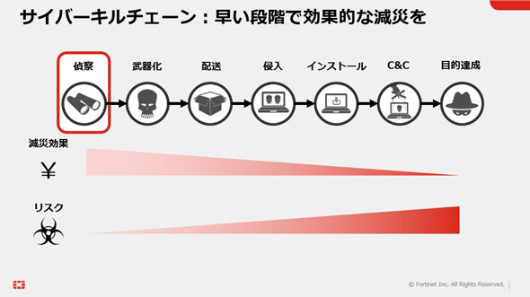 最近になってから、この「攻撃者目線」を取り入れたサイバーセキュリティ戦略の注目度が高まっています。サイバーキルチェーンで示されるように、アタックサーフェスの探索(ReconnaissanceあるいはRecon)は、サイバー攻撃における初期段階のプロセスです。この段階において、侵害を受けるリスクをどれだけ最小化できるかどうかが、組織やビジネス全体のリスクを低減できるかの重要なポイントとなってくるでしょう。