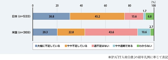 データを活用した取り組みの課題として筆頭に挙げられるのが人材不足だ。情報処理推進機構(IPA)が2021年に実施した調査では「DXを推進する上で人材の質、量ともに不足している」と回答した企業が全体の約8割を占めた(注2)。