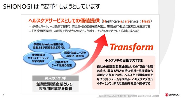 塩野義は創業144年の老舗製薬企業。これまでは創薬力を武器に成長してきたが、2030年に向けた中長期戦略では「新たなプラットフォームでヘルスケアの未来を創り出す」をスローガンに掲げている。これは創薬だけでなく、ヘルスケア全体を見て価値を創造するために、HaaS(Healthcare as a Service)企業へと変革することを意味する。