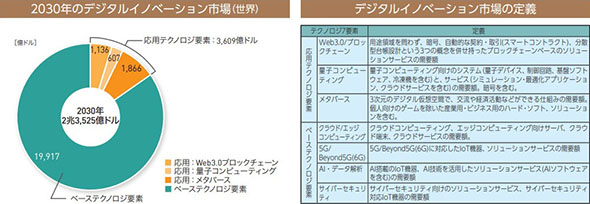 その結果、2030年のデジタルイノベーション市場は、世界で2兆3525億ドル(対2021年比で年平均13.1%増)、日本で14兆3000億円(同14.9%増)に達する見通しだ(図1)。なお、為替レートは、2021年を1ドル=109.5円、2022年以降を1ドル=128.6円で計算した。2022年は2022年1〜10月の単純平均レートを使用、2023年以降の為替は2022年と同一と見なしている。