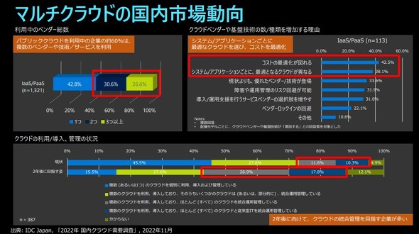 「(図1)左上のグラフを見ると、多くの企業が複数のクラウドを利用していることが分かります。その理由としては『コストの最適化』『システムやアプリケーションごとに最適なクラウドが異なる』といった背景があり、それぞれのクラウドを組み合わせることでユーザーはメリットを感じています」(岡嵜氏)