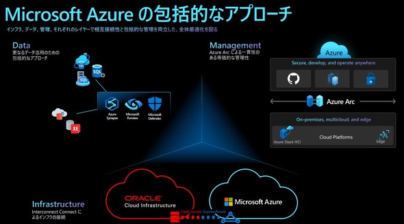 2つ目は「マネジメント」だ。Microsoftはマルチクラウドとオンプレミスの管理プラットフォームに一貫性をもたらすために「Azure Arc」を提供しており、岡嵜氏は「エッジやオンプレミス、異なるクラウドといったさまざまな環境で動作する仕組みで、統一された運用管理を実現している」とした。3つ目が「インフラストラクチャ」だ。Oracleとの協業は主にこのインフラストラクチャの観点で大きな意味を持ち、同氏は以下のように発言した。