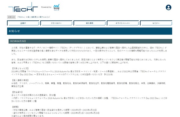 IT・テクノロジー情報サイトの『TECH+』で情報漏えいが判明した。