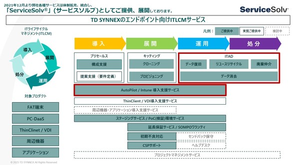 TD SYNNEX は、グローバルに広がる巨大なサプライチェーンを生かして、各企業のニーズに合わせた Windows 11 搭載ビジネス PC を含むサービスを提供している。前述の ServiceSolv の一環で端末の導入から展開、運用、処分までのライフサイクル全体をカバーする「エンドポイント向け ITLCM サービス」は、業務担当者の負荷に配慮した手厚いサポートが定評だ。